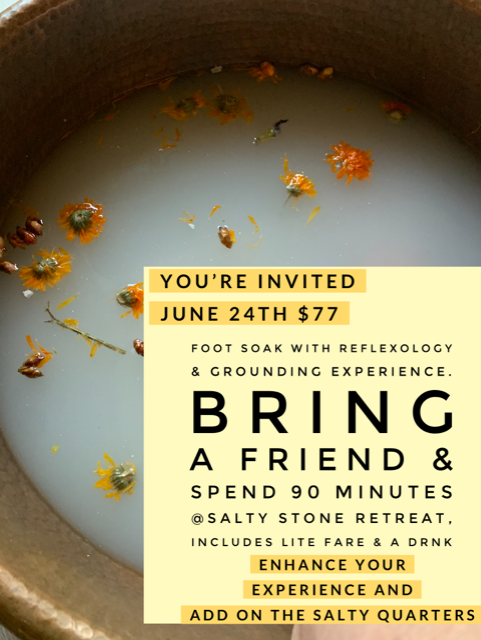 Saturday June 24th is a Salty Stone Retreat's hosted booking with special offerings: 724-396-4337 text to enjoy a 90 minute experience with a friend and enjoy a bite to eat with a drink at this price of $77 and a 2 for one offering to enjoy our Salty Quarters: salt room, sauna, crystal lights, and oxygen bar